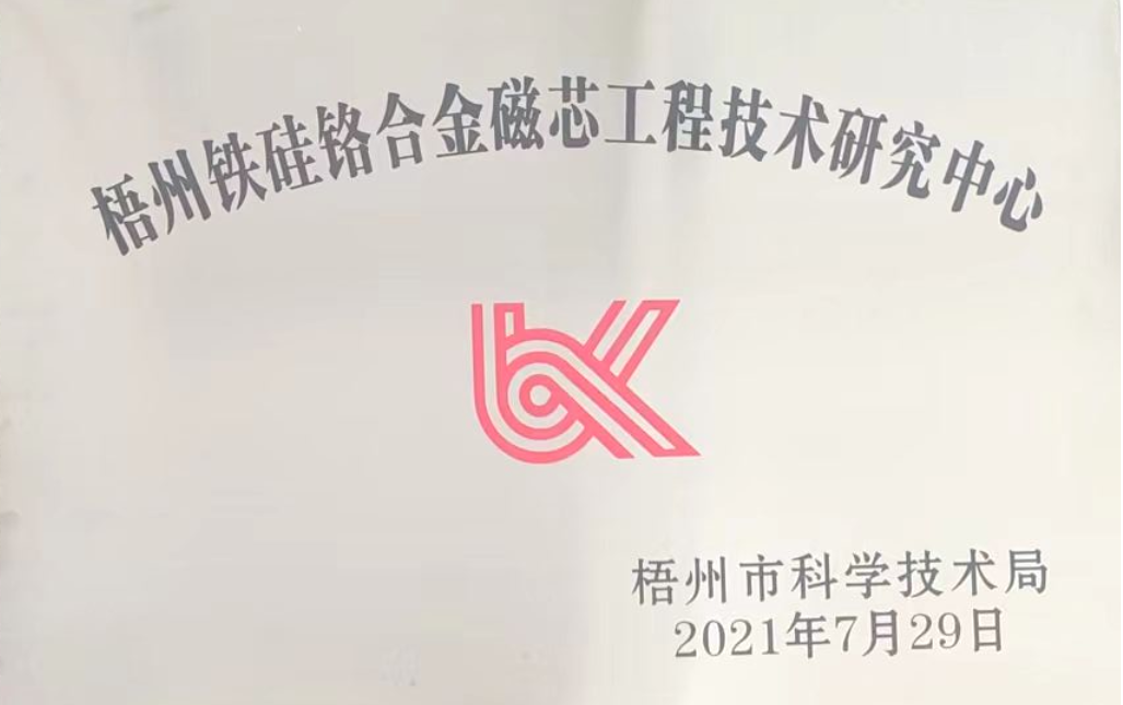 梧州铁硅铬合金磁芯工程技术研究中心——梧州市科技局颁发